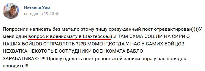 да наоборот надо скорее в Сирию. Ну толк за 15к сдыхать? Если уж подыхать, хо ехали бы в пустыню, там хоть платят. Какой-то шанс заработать на домик в Твери....