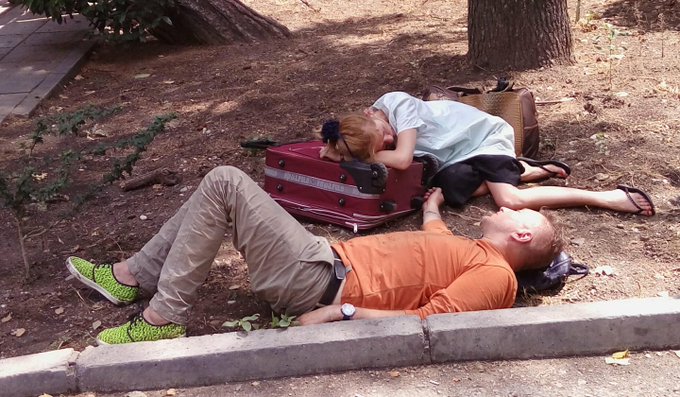А я всегда уставшая и тоже после поезда не отходя далеко так засыпаю, как девушка на фото. А обувка у молодого человека стильная. Небось подруга поносить дала.