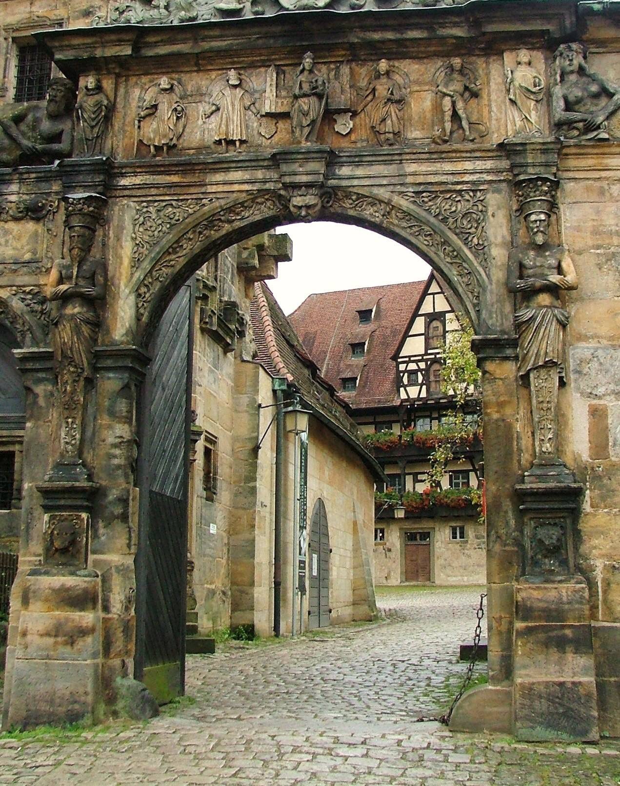 Ворота в Старый двор, слева исторический музей. Старый епископский городок в Баварии.