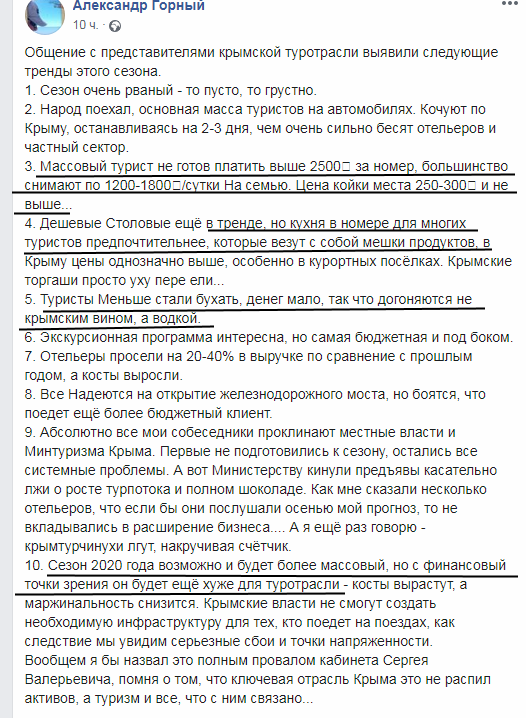 Взагалі важливість туризму для Криму дуже перебільшена. Там пенсіонери та бюджетники весь час мешкали. Статистика за 13й рік давала 25% працюючого населення. Інше держслужбовці, бюджетники, пензіонери зі школярами.