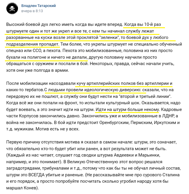 МобилиZадники массово отказываются воевать, пишут всякие обращения, а зачастую просто натихаря динамят. Черносотенные телеги всерьёз судачат про необходимость реальных показательных расправ над невоевитыми мобилиZадниками.