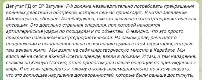 Sep. 20th, 2023 12:41 amАзеры пользуясь тем, что украинцы сейчас Россиюшку опустили, торопятся закрыть карабахский вопрос. Ватаны во Вконтактике единодушно на антиармянских позициях, горланят "так им и надо!" Читаешь камменты и теряешься, кто больший враг гаястанцев - азеры или россияне? Реально такой поток ненависти на армян со всех Z_щелей. Черносотенный Затулин на этом фоне выгладит белой вороной, отчаянные хлопанья крыл уже обезглавленного петуха.