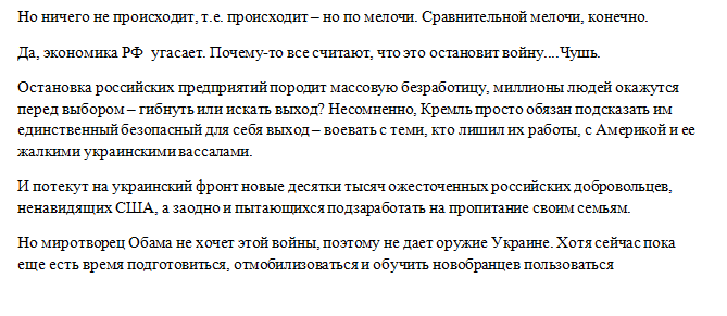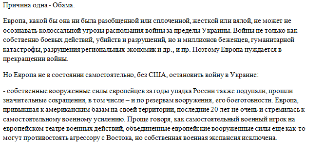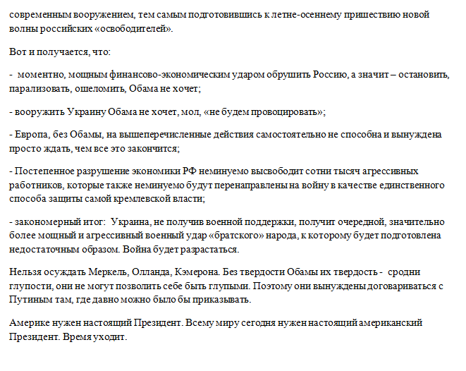 Не все так однозначно. Хотя Обама уже практически официально признан в США одним из самых слабых президентов в истории, а по словам журналистов-американистов (Михаил Таратута), "Обама нерешителен до степени неспособности принять решение в критической ситуации". И я думаю, что Обама лично боится Путина, как ботаник гопника. Но думаю, там масса подводных камней, и Путин крепко держит Обаму за яйца. Опять же как гопник ботана. Ничего не поделаешь- это как в детской сказке- "лев с сердцем мышонка". Против гопника нужен либо другой гопник, либо крутой мент, который сначала бьет, а потом разговаривает. Думаю, Путин точно угадал слабые струны Обамы и его советников и умело на них играет. А так же у европейцев. Отсюда такая наглость и хамство. Время политических пигмеев.