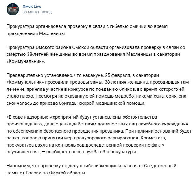 Что ещё могло произойти в Омске во время обряда пожирания блинов с лопаты? Конечно смерть!