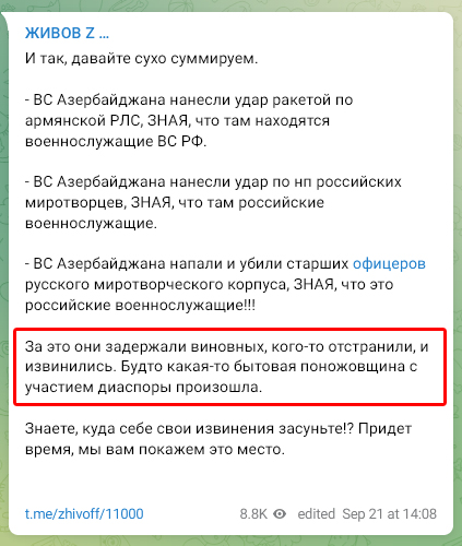 А откуда азербайджанцам знать, что это россиянские миротворцы? На них не написано. И вообще, их там практически нет. Были бы - занимались бы чем им положено, а именно: миротворческой деятельностью, а не тем, чем они там занимались.