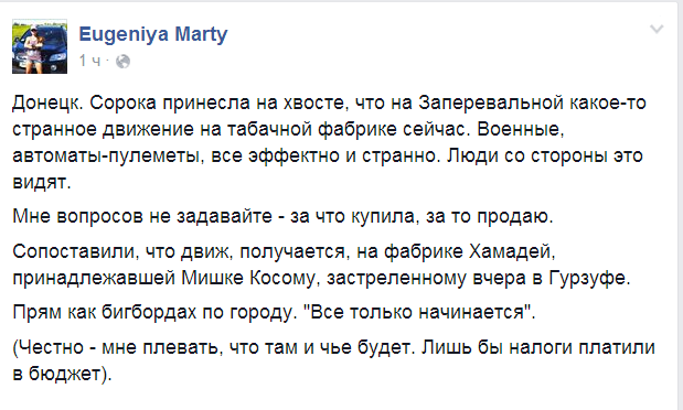 Любопытная вывеска на заднем фоне: "СИГАРЕТЫ работаем". Табачный бизнес замоченного вчерась в Крыму Мишани Косого и не думал останавливаться, а наоборот только наращивал обороты - легальные поставки курева истощились, а свято место пусто не бывает. И вот уже на табачной фабрике Мишани суета и делёжка