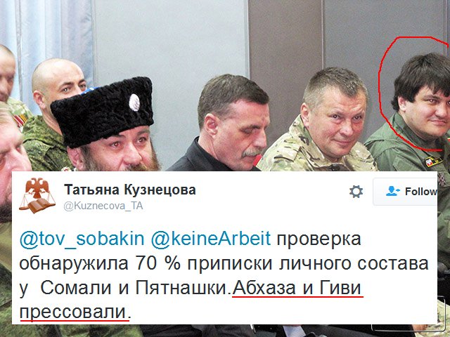 Обведённый красным - Абхаз. А Гиви в Крым не пригласили - таблом не вышел. Походу калорадские рапорты про "патерьнетЪ" - главным образом для Кремля. Погибших калорады никак не оприходуют, чтобы получать за них довольствие, выделяемое Путиным для копротивленцев. Потому и получается, что на бумаге большая часть в строю - мёртвые.