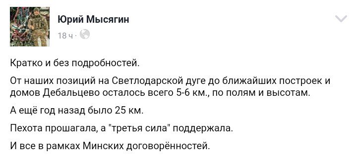 Jan. 20th, 2017 03:09 pmЗахарченко перед поездкой в Крым кукарекнул по телеку требование любой ценой не допустить занятие ВСУ серой зоны. На Светлодарской дуге калорады подтянули резервы