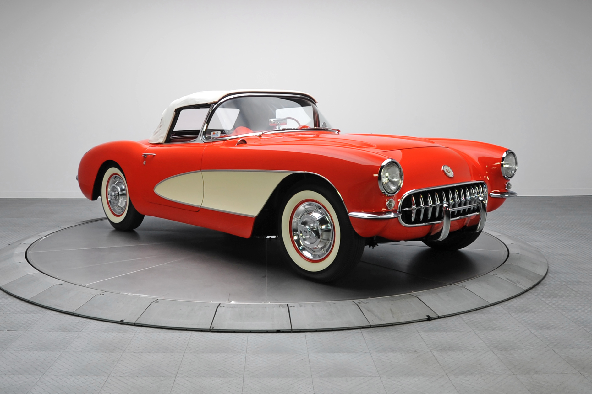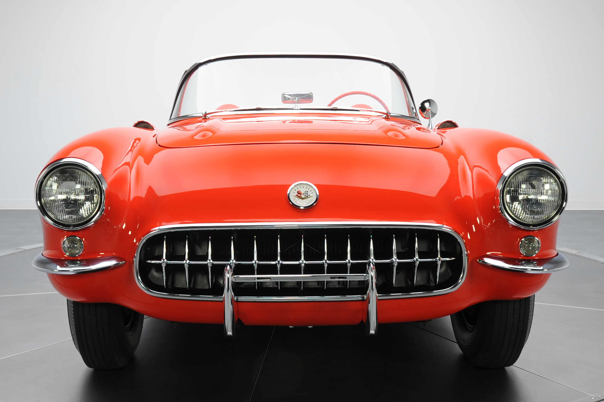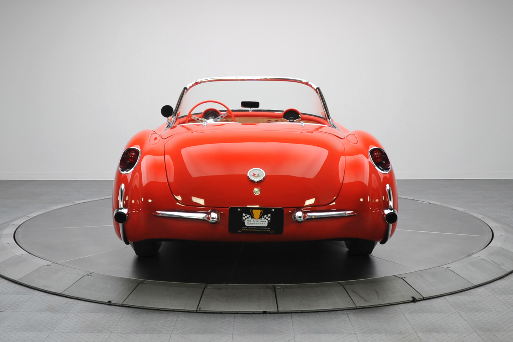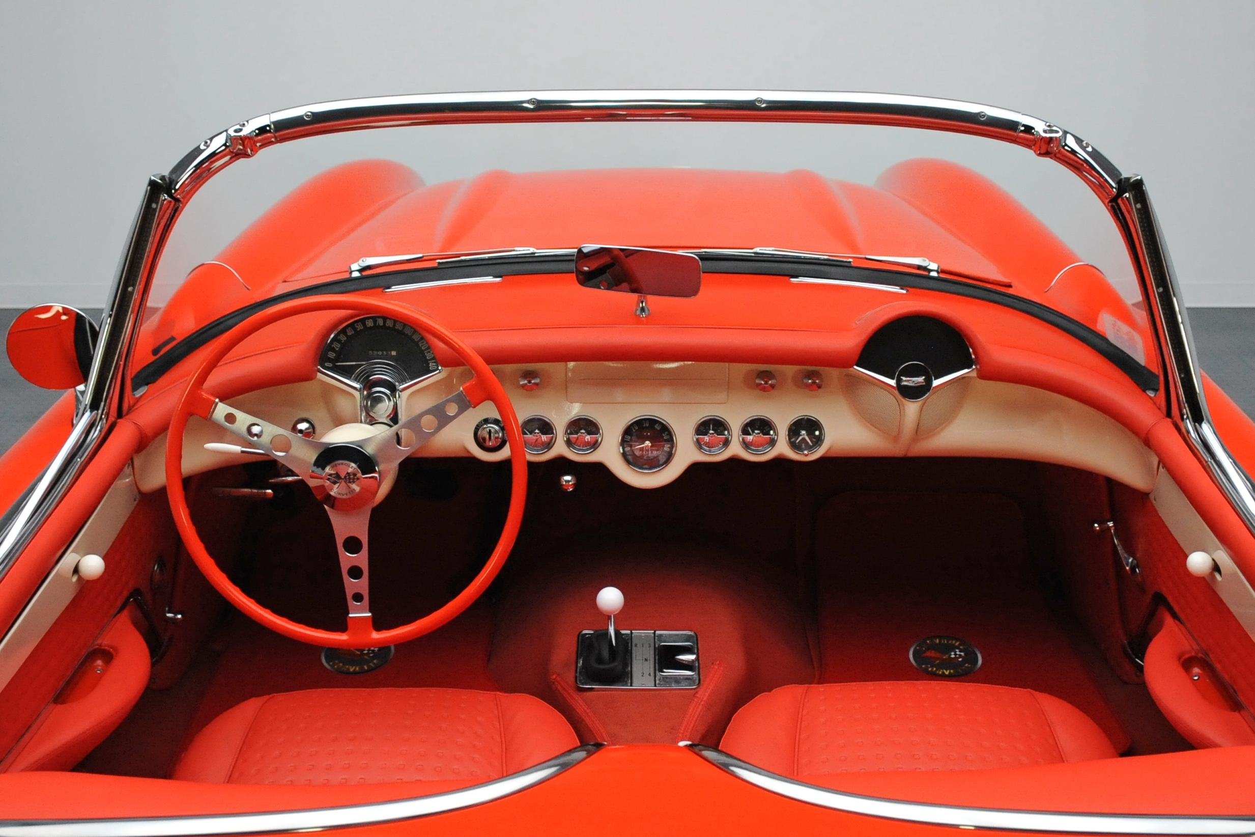 Первое поколение спорткаров Шевроле было представлено публике в 1953 году и выпускалось вплоть до 1963 года. Кузов стеклопластиковый, движок сперва был рядной шестёркой с мощностью в 150 лошадей и авто было не шибко уж и резвым даже на то время, что закономерно привело к плохим продажам спорткара, на который Шевроле делало немалые ставки. Ситуацию удалось выправить заменой двигателя - сперва стали устанавливать V8 на 4.3 литра, затем 4.6 литра, как на представленном экземпляре, мощностью 283 лошадки и автомобиль полетел - разгонялся до сотни за 7 секунд. На Дайтоне Корвет разогнали до 241 км/ч, что незамедлительно сказалось на рыночном спросе - продажи повалили. Продавался автомобиль по цене от $2,774 до $4,038 за последние самые навороченные модели.