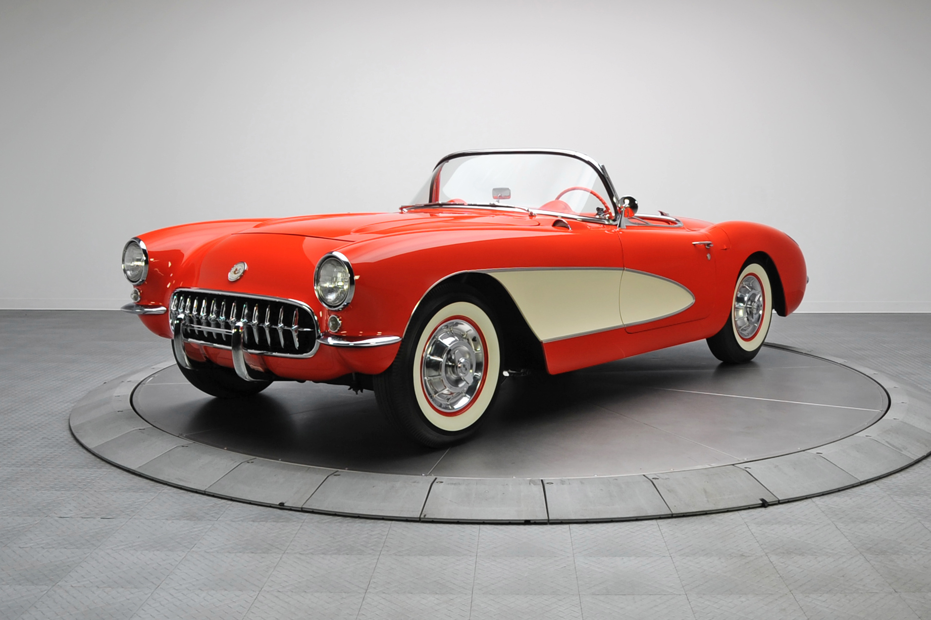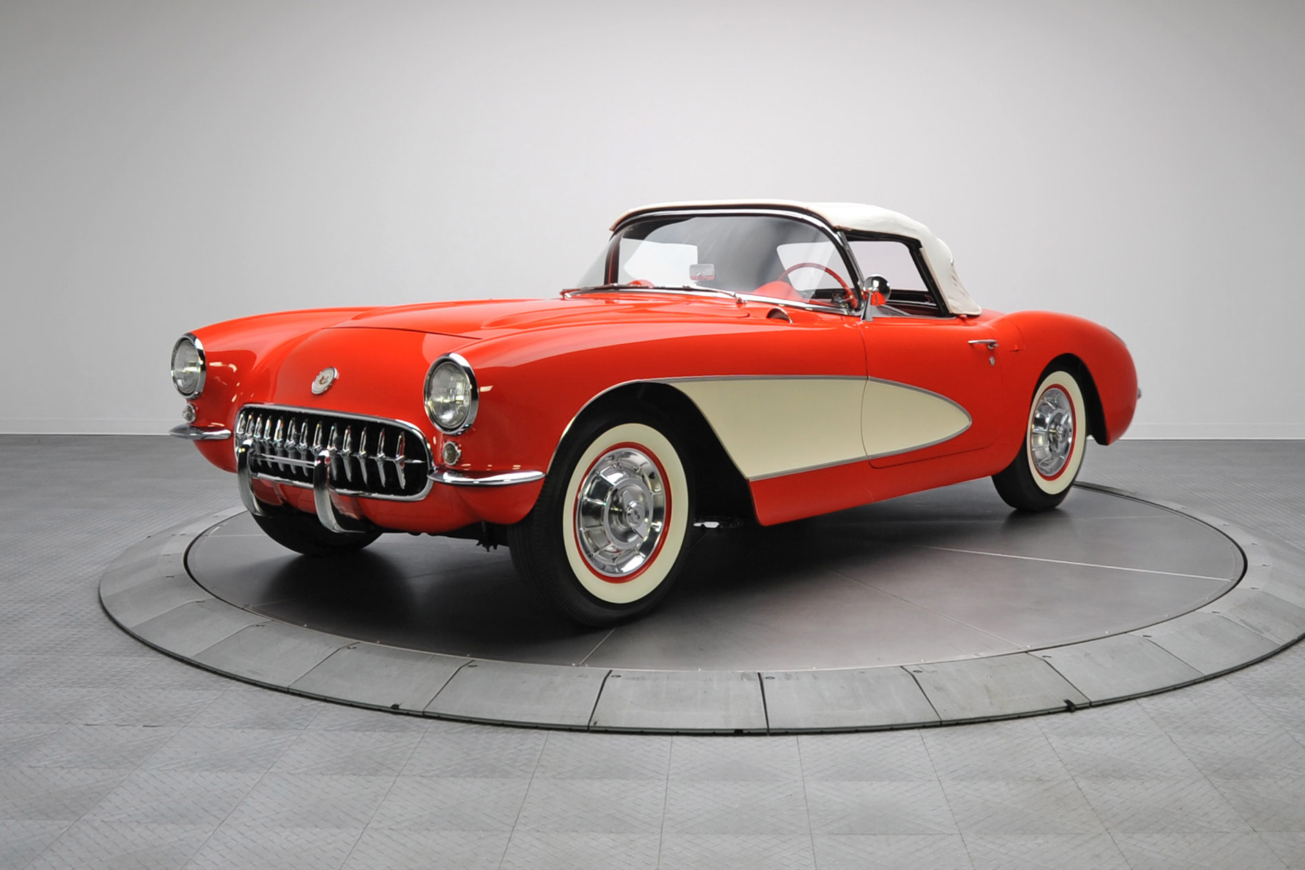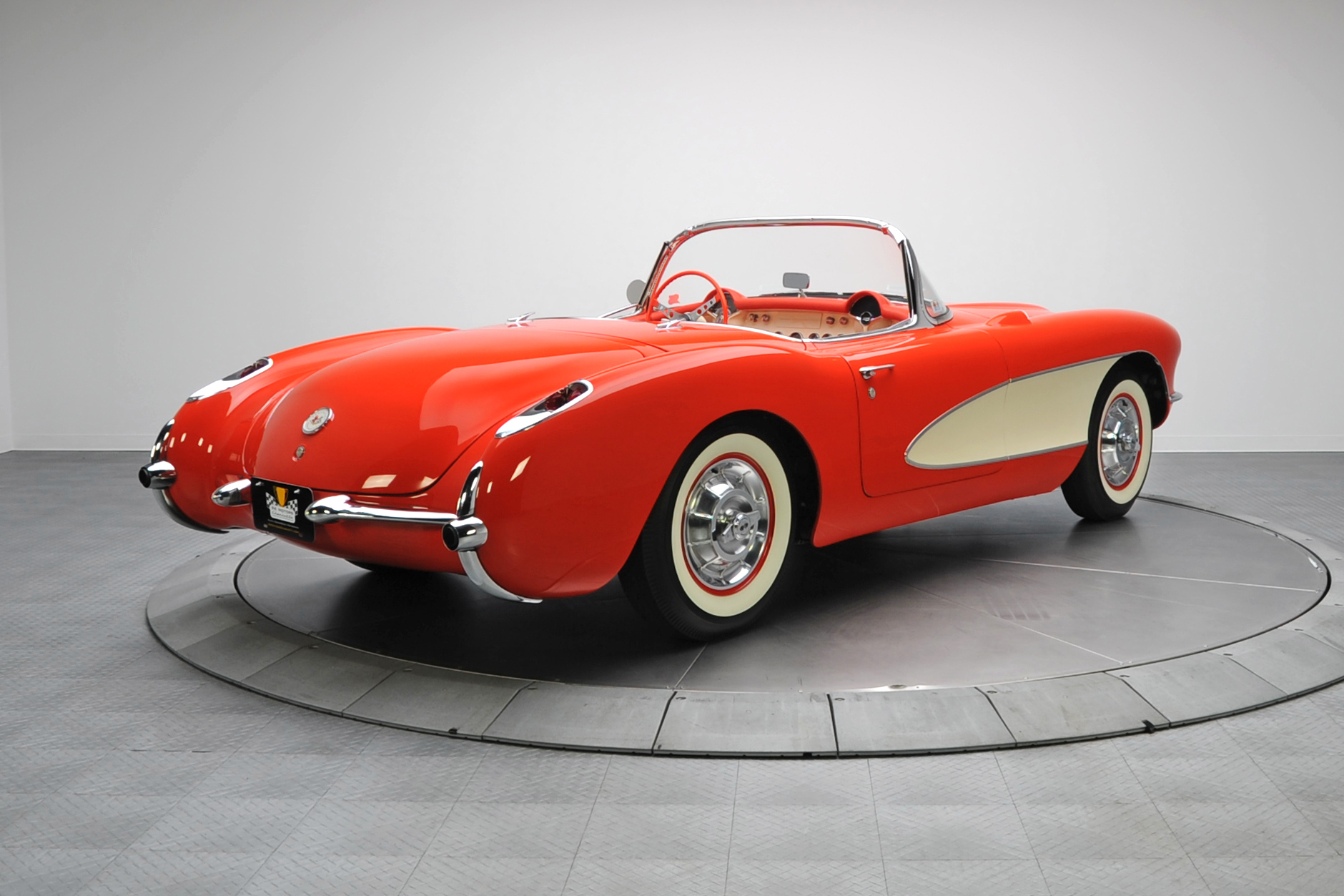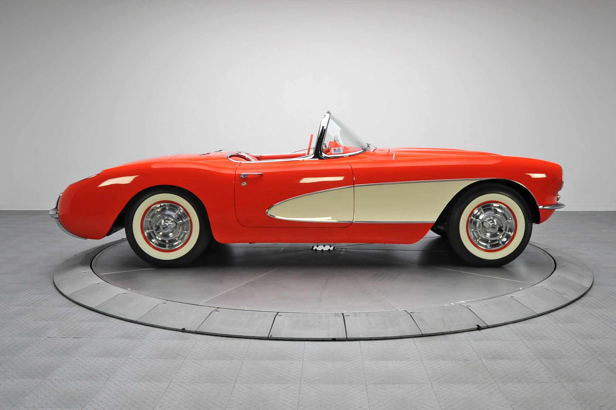 Первое поколение спорткаров Шевроле было представлено публике в 1953 году и выпускалось вплоть до 1963 года. Кузов стеклопластиковый, движок сперва был рядной шестёркой с мощностью в 150 лошадей и авто было не шибко уж и резвым даже на то время, что закономерно привело к плохим продажам спорткара, на который Шевроле делало немалые ставки. Ситуацию удалось выправить заменой двигателя - сперва стали устанавливать V8 на 4.3 литра, затем 4.6 литра, как на представленном экземпляре, мощностью 283 лошадки и автомобиль полетел - разгонялся до сотни за 7 секунд. На Дайтоне Корвет разогнали до 241 км/ч, что незамедлительно сказалось на рыночном спросе - продажи повалили. Продавался автомобиль по цене от $2,774 до $4,038 за последние самые навороченные модели.