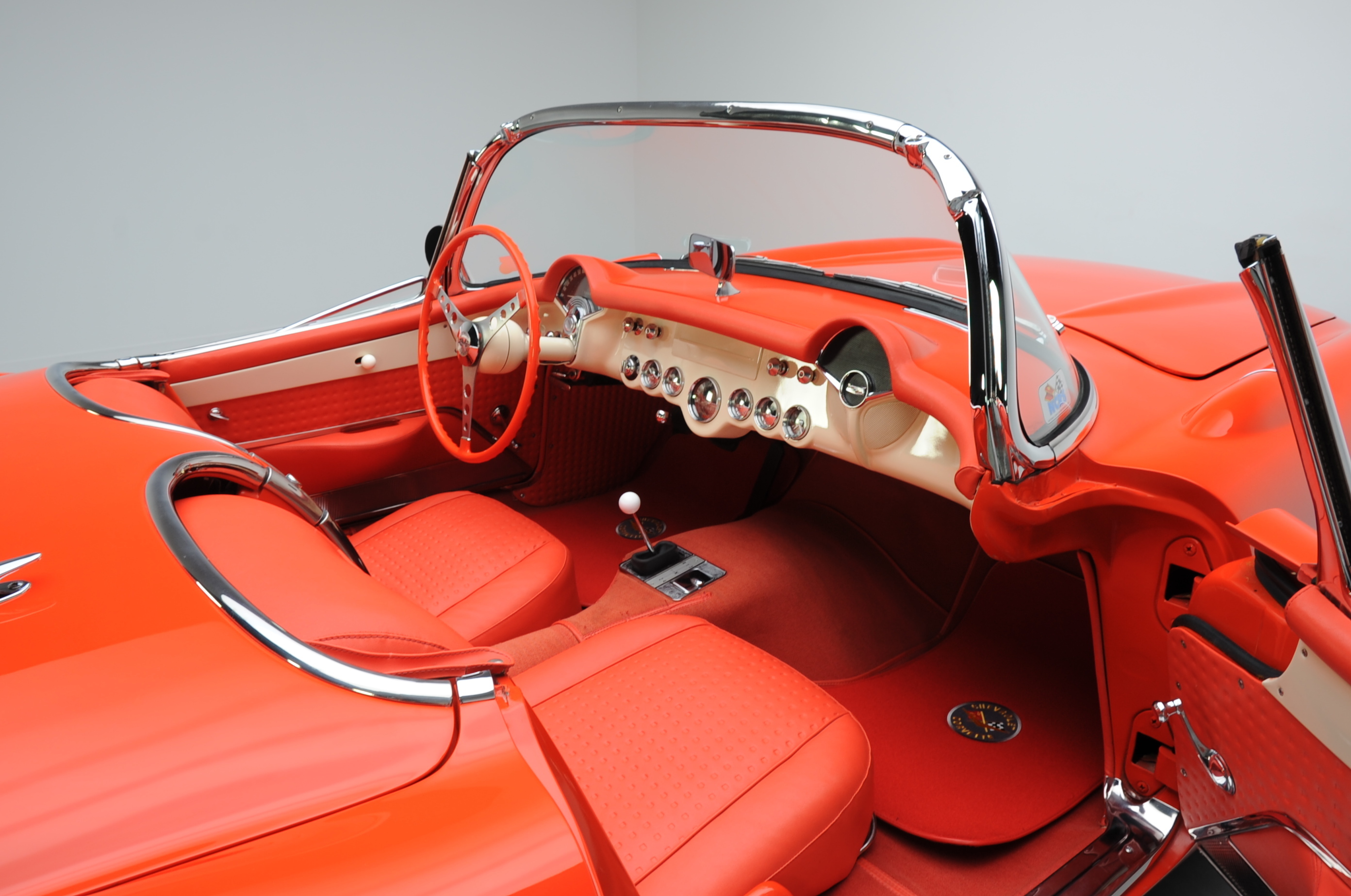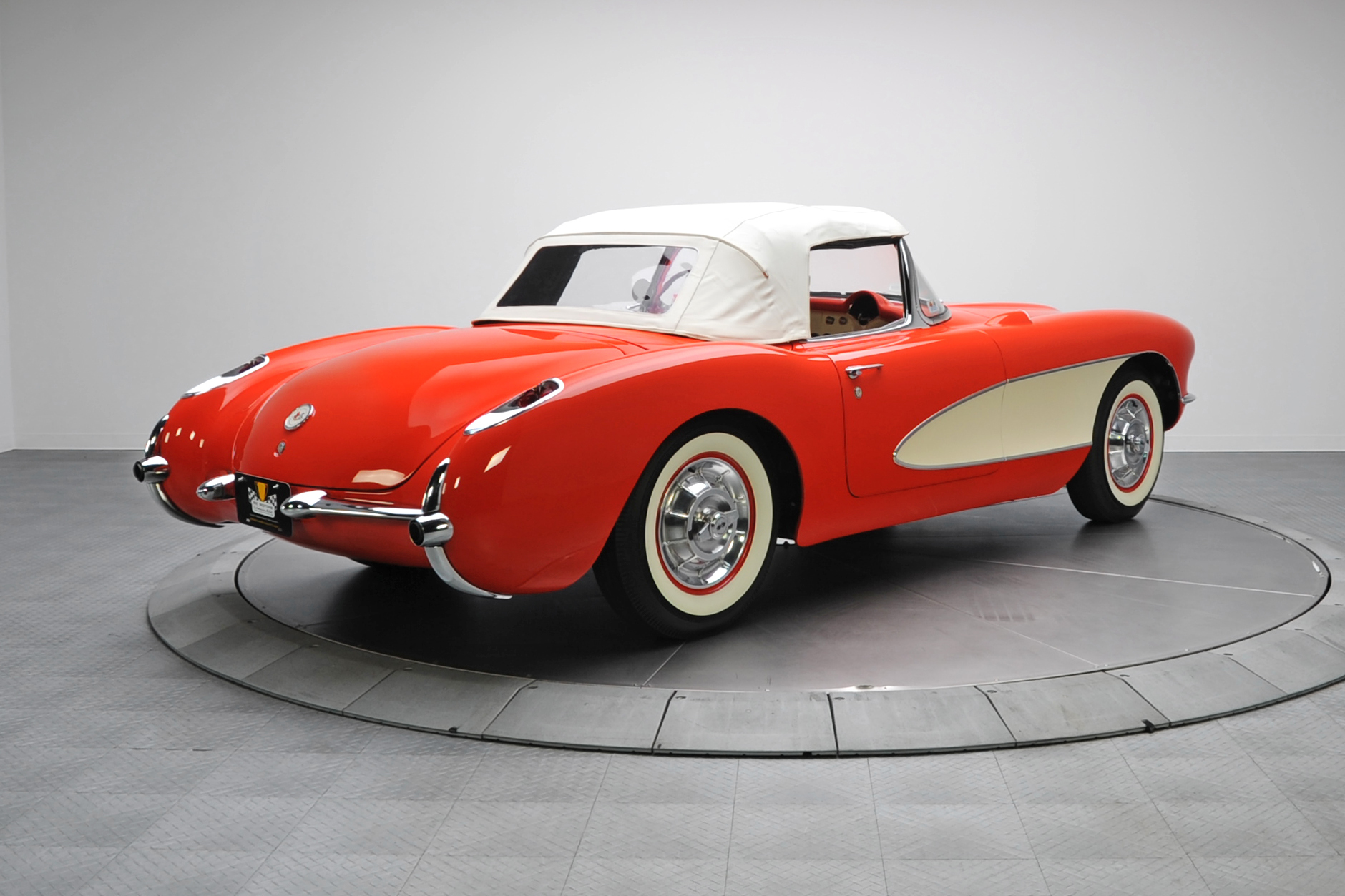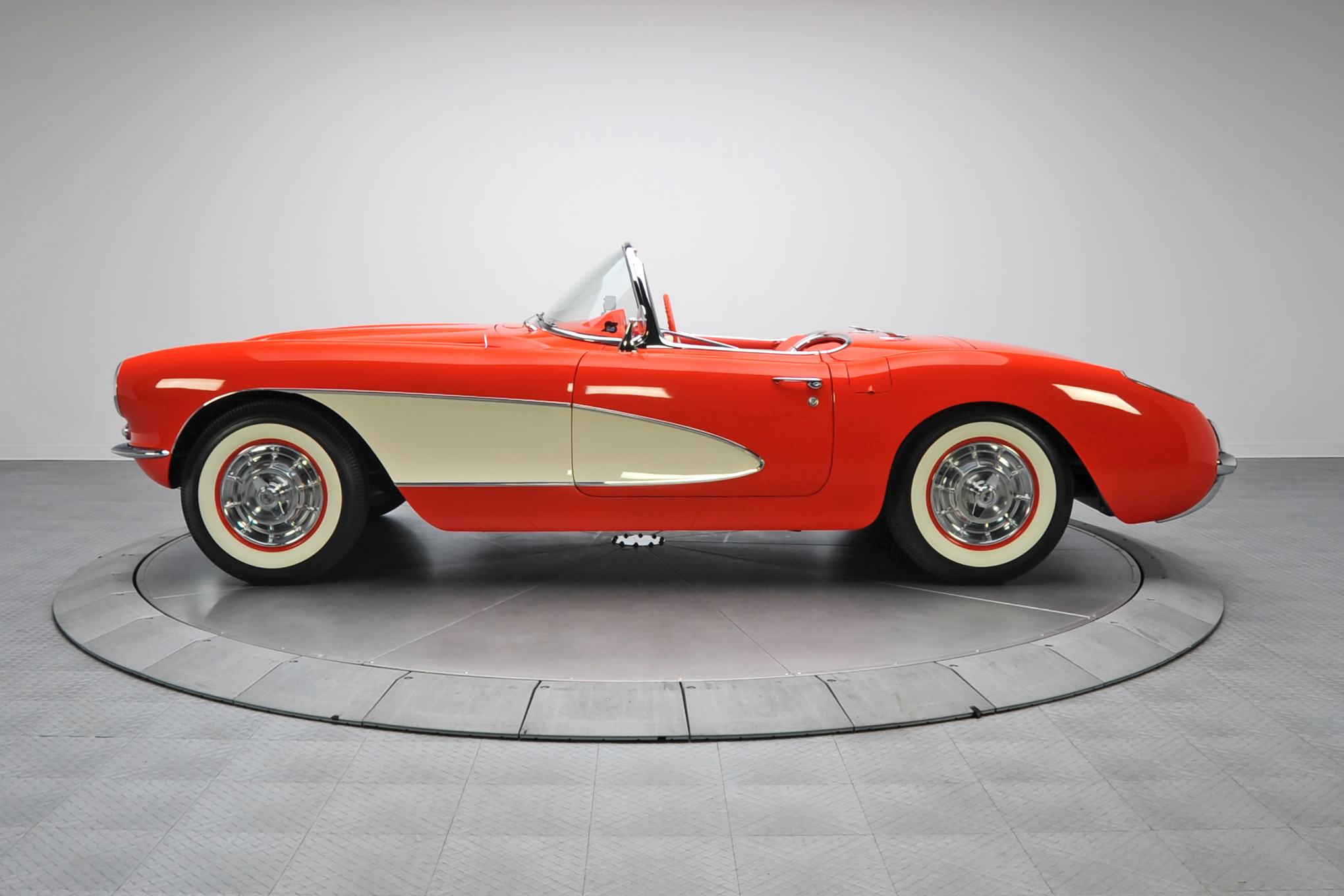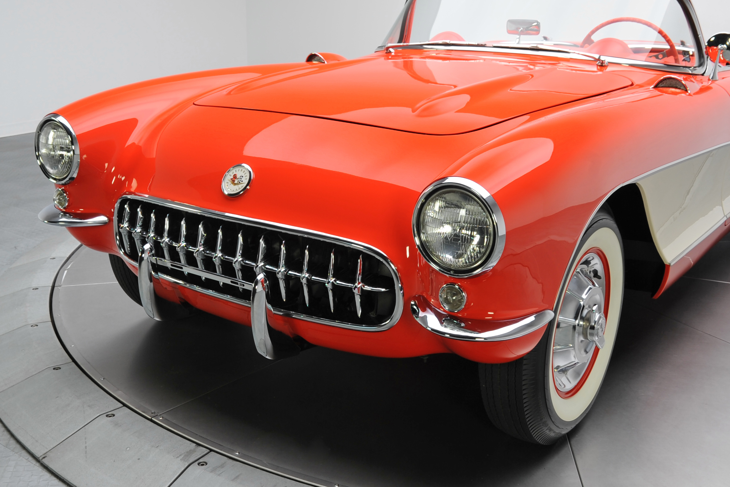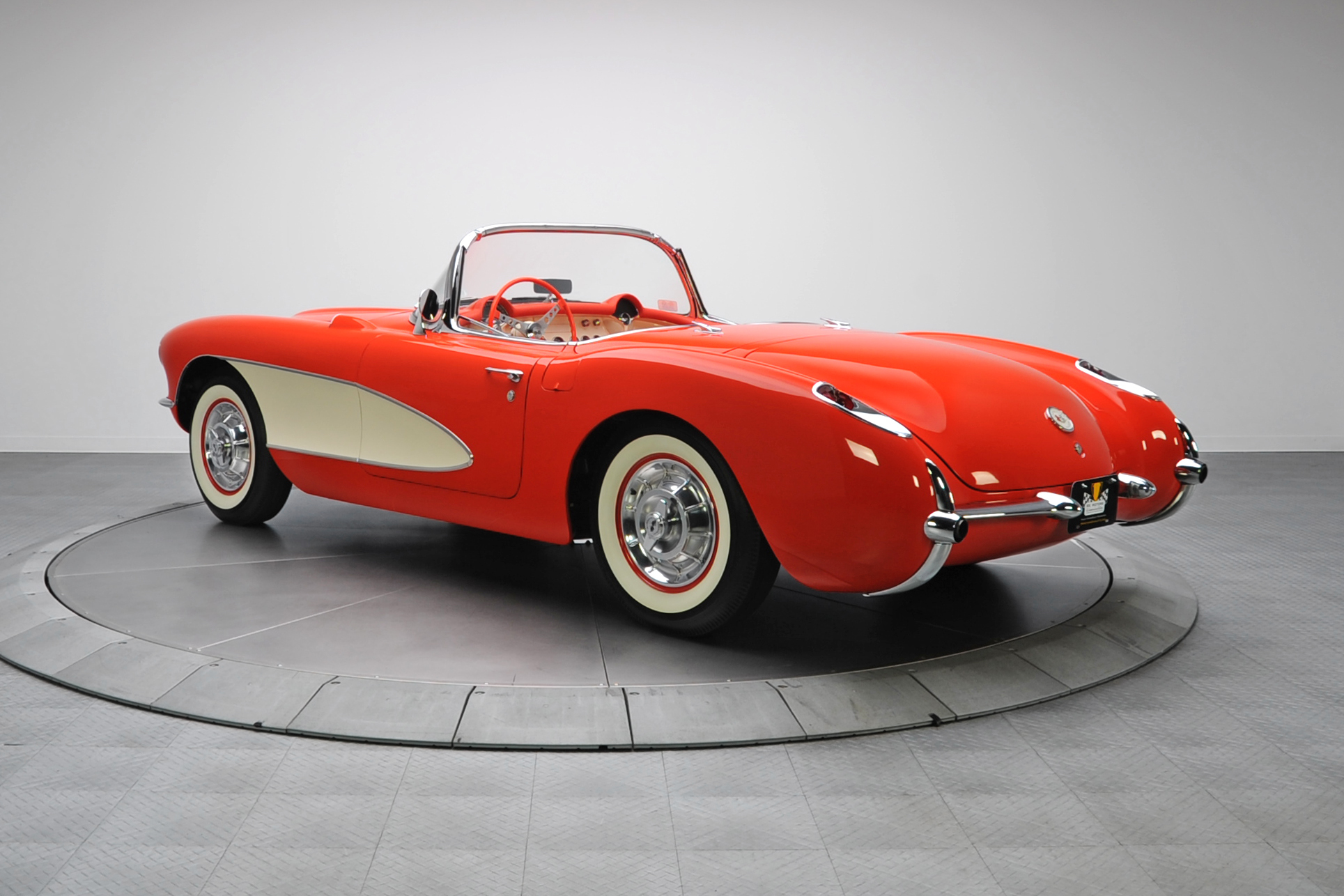 Первое поколение спорткаров Шевроле было представлено публике в 1953 году и выпускалось вплоть до 1963 года. Кузов стеклопластиковый, движок сперва был рядной шестёркой с мощностью в 150 лошадей и авто было не шибко уж и резвым даже на то время, что закономерно привело к плохим продажам спорткара, на который Шевроле делало немалые ставки. Ситуацию удалось выправить заменой двигателя - сперва стали устанавливать V8 на 4.3 литра, затем 4.6 литра, как на представленном экземпляре, мощностью 283 лошадки и автомобиль полетел - разгонялся до сотни за 7 секунд. На Дайтоне Корвет разогнали до 241 км/ч, что незамедлительно сказалось на рыночном спросе - продажи повалили. Продавался автомобиль по цене от $2,774 до $4,038 за последние самые навороченные модели.