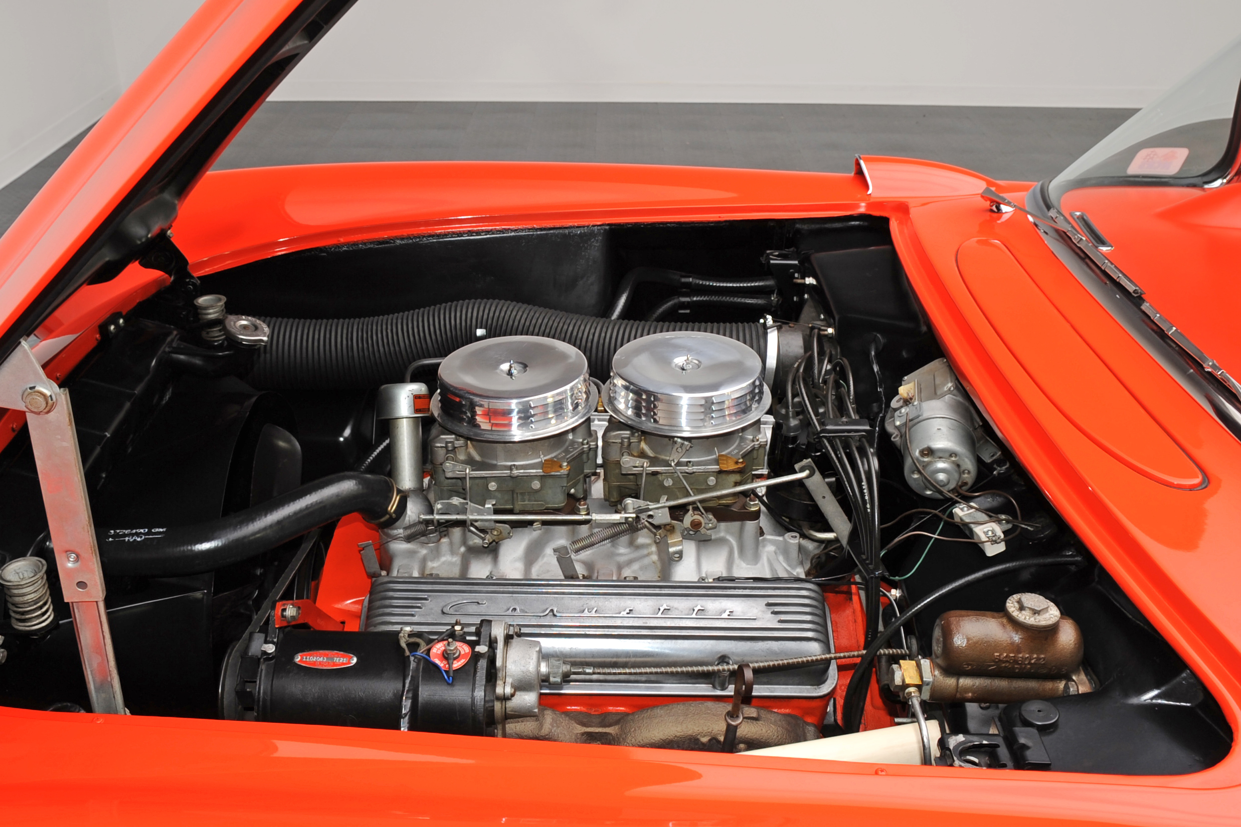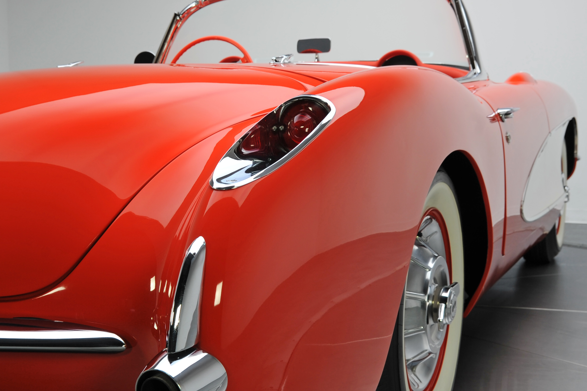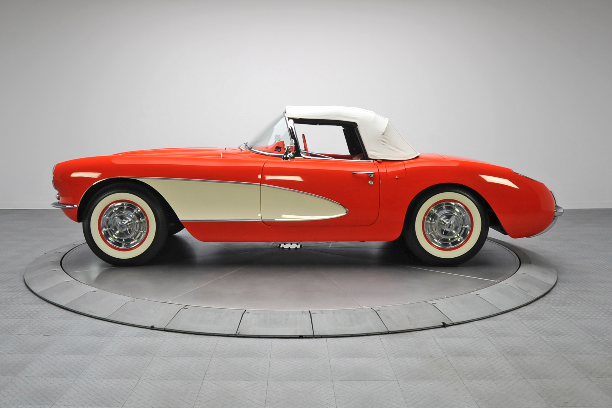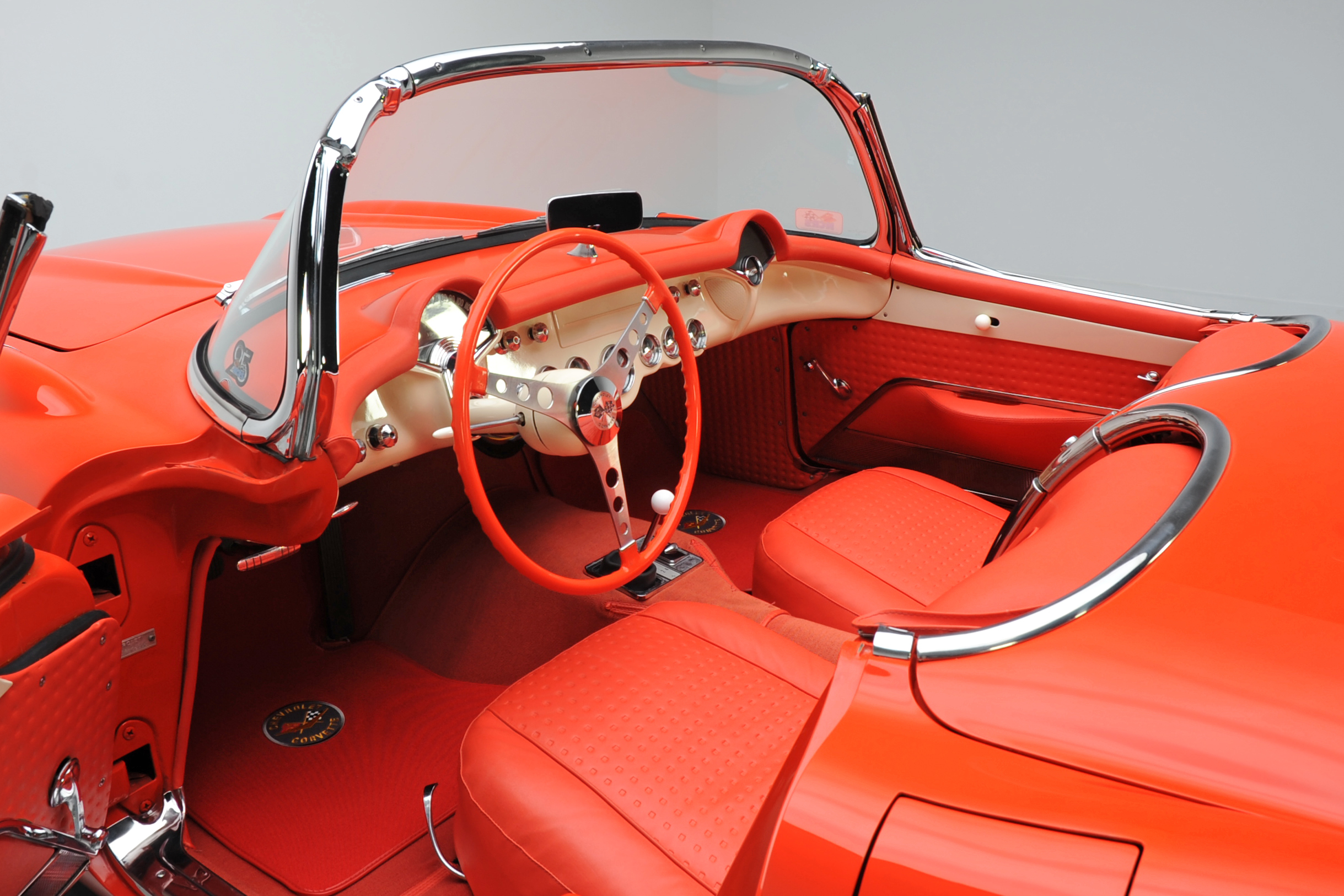 Первое поколение спорткаров Шевроле было представлено публике в 1953 году и выпускалось вплоть до 1963 года. Кузов стеклопластиковый, движок сперва был рядной шестёркой с мощностью в 150 лошадей и авто было не шибко уж и резвым даже на то время, что закономерно привело к плохим продажам спорткара, на который Шевроле делало немалые ставки. Ситуацию удалось выправить заменой двигателя - сперва стали устанавливать V8 на 4.3 литра, затем 4.6 литра, как на представленном экземпляре, мощностью 283 лошадки и автомобиль полетел - разгонялся до сотни за 7 секунд. На Дайтоне Корвет разогнали до 241 км/ч, что незамедлительно сказалось на рыночном спросе - продажи повалили. Продавался автомобиль по цене от $2,774 до $4,038 за последние самые навороченные модели.
